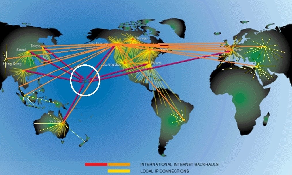 This diagrams below, note the second one where I have encircled Hawaii in white, the images depict bidirectional links westward to Asia, this is 100% totally fabricated. The “Hawaii as the gateway to Asia” narrative promoted by Ron and the leadership team was marketing fiction. It did not work that way then. It does not work that way now. There was never a technical reason for it. It was a story that made Ron sound like he found a *genius* shortcut to Asia.