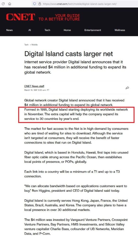 Additional corroboration (CNET, Mar 10, 1997): CNET reports Digital Island was “formed in 1995” and “started deploying its worldwide network in November,” consistent with the 1996 executed-agreement + Q4 execution record already established by Exhibits 8, 10, 14 [Exhibit 14]