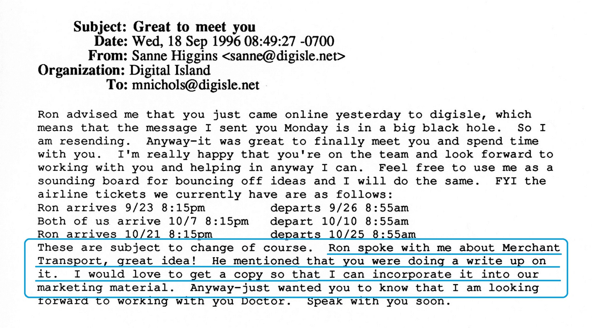 What began as translation and digital publishing evolved into Merchant Transport and browser-based transactions. In the second week of September 1996, during my visit to Hawaii with Ron and Sanne, I walked Ron through a concrete product outline for a virtual merchant transaction service delivered through a web page.