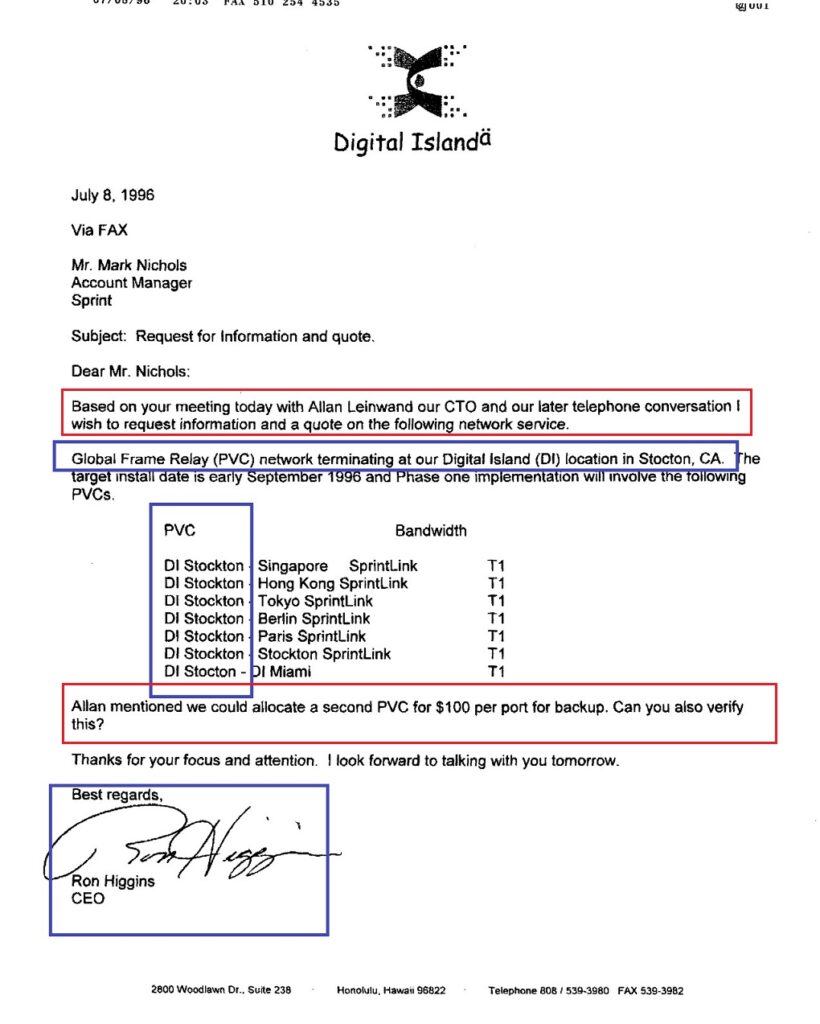 A fax dated Jul 8, 1996 requests information and pricing for “Global Frame Relay (PVC)” service terminating at the Digital Island location in Stockton, California, and lists multiple international endpoints (Singapore, Hong Kong, Tokyo, Berlin, Paris, etc.). Ron Higgins signs as CEO. [Exhibit A]