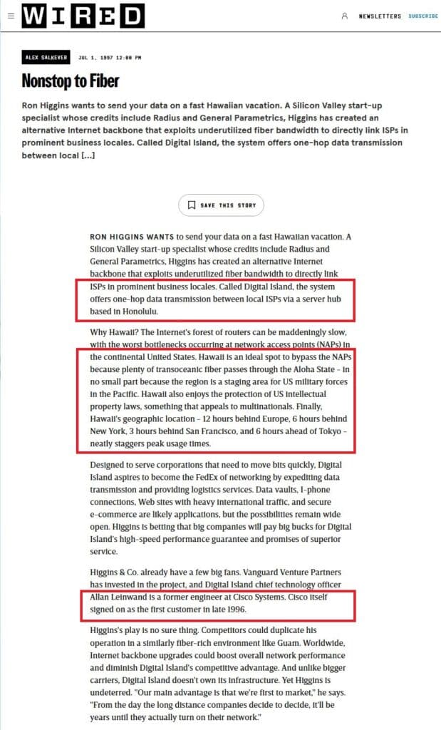 A WIRED story dated Jul 1, 1997 restates the Hawaii-hub concept in explicit technical language, describing “one-hop” data transmission “via a server hub based in Honolulu,” and presenting Hawaii as ideal to bypass mainland U.S. NAP bottlenecks because transoceanic fiber “passes through” the state. The same article identifies Digital Island’s CTO (Allan Leinwand) within the same narrative context. [Exhibit I]