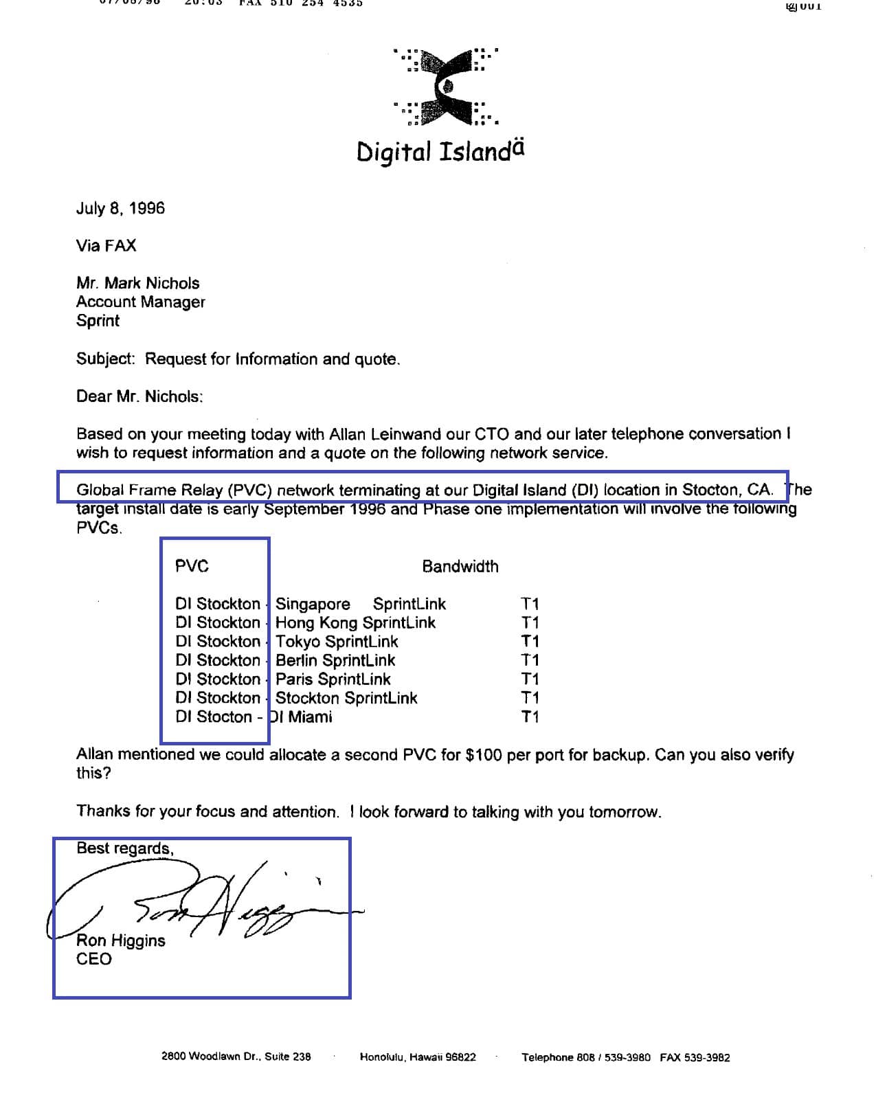 From June 1996 forward, I stated explicitly that Hawaii was never the value proposition. The value proposition was the service architecture and interconnection strategy executed from California, where carrier demarcations, peering points, and operational control actually exist.