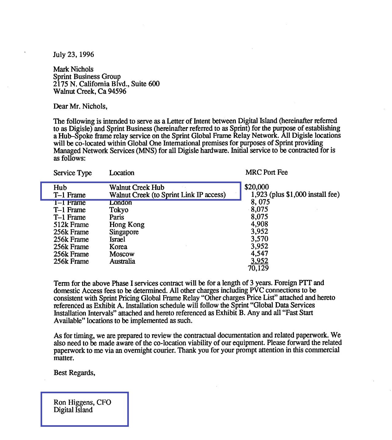 Entry Date and Operational Role. On August 5, 1996, I joined Ron and Sanne Higgins to build what became Digital Island. At that time, the company had no operating network, no executed customer contracts, and no institutional funding. The work underway involved business formation, network architecture design, customer acquisition, and infrastructure planning.