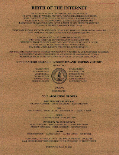 A plaque can honor important protocol work without falsely claiming the birth of the Internet. A university marker can commemorate a major contribution without collapsing an already existing operational internetwork into a later Stanford-centered origin myth.
